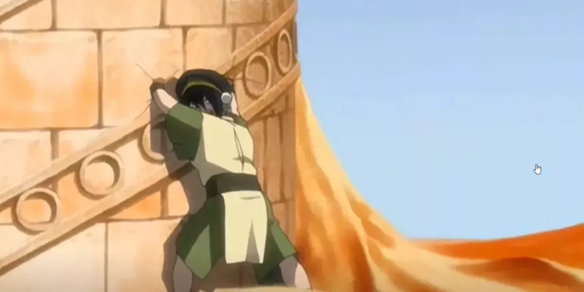 3 Suki salva a Sokka y a Toph de caer al vacíoEl equipo Avatar se ofrece a dividir sus tareas para la misión final, y Toph, Sokka y Suki se encargan de manejar las nuevas aeronaves de Ozai. Toph y Sokka logran cumplir su misión, pero se encuentran colgados de una cornisa.
