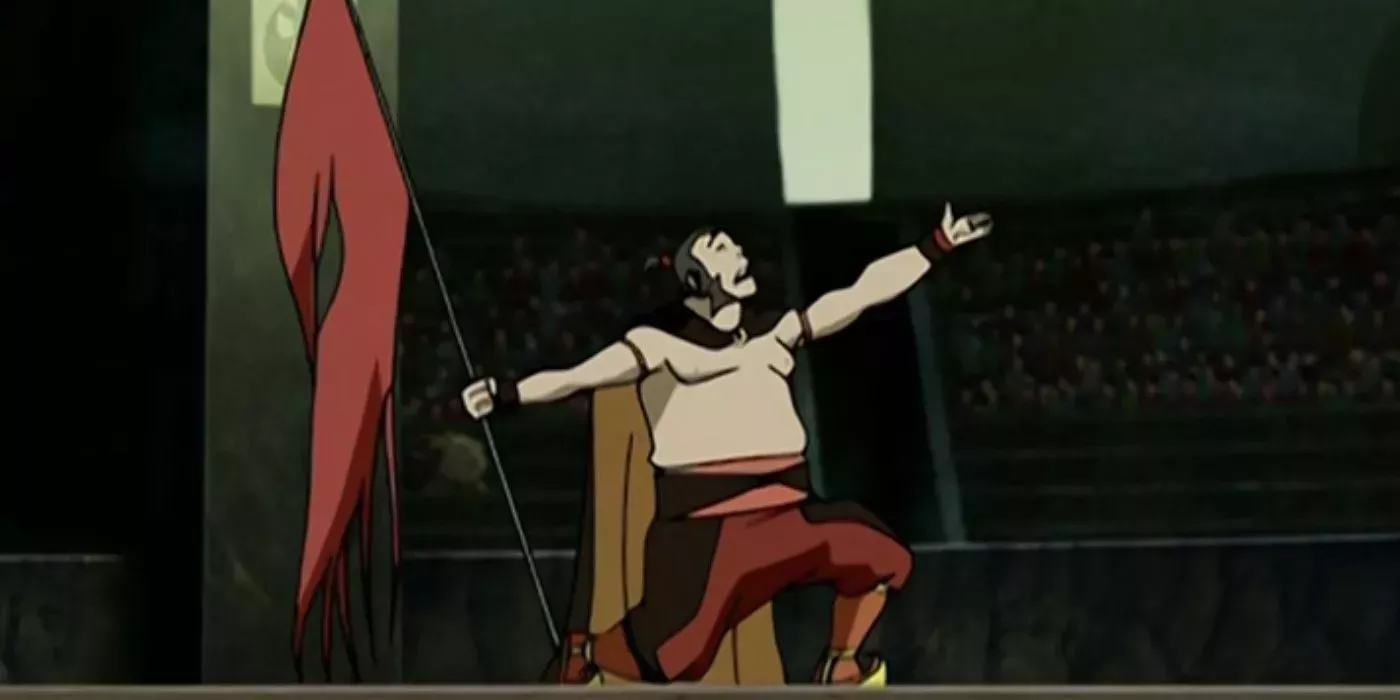 6 El hombre de la nación del fuego es débil y odiado por todosEl Hombre de la Nación del Fuego es un maestro tierra poco querido en los torneos del Earth Rumble. El Hombre Nación del Fuego era un maestro tierra que desfilaba por los torneos con un atuendo inspirado en la Nación del Fuego, una capa roja, un peinado tradicional de la Nación del Fuego y una gran bandera de la Nación del Fuego.