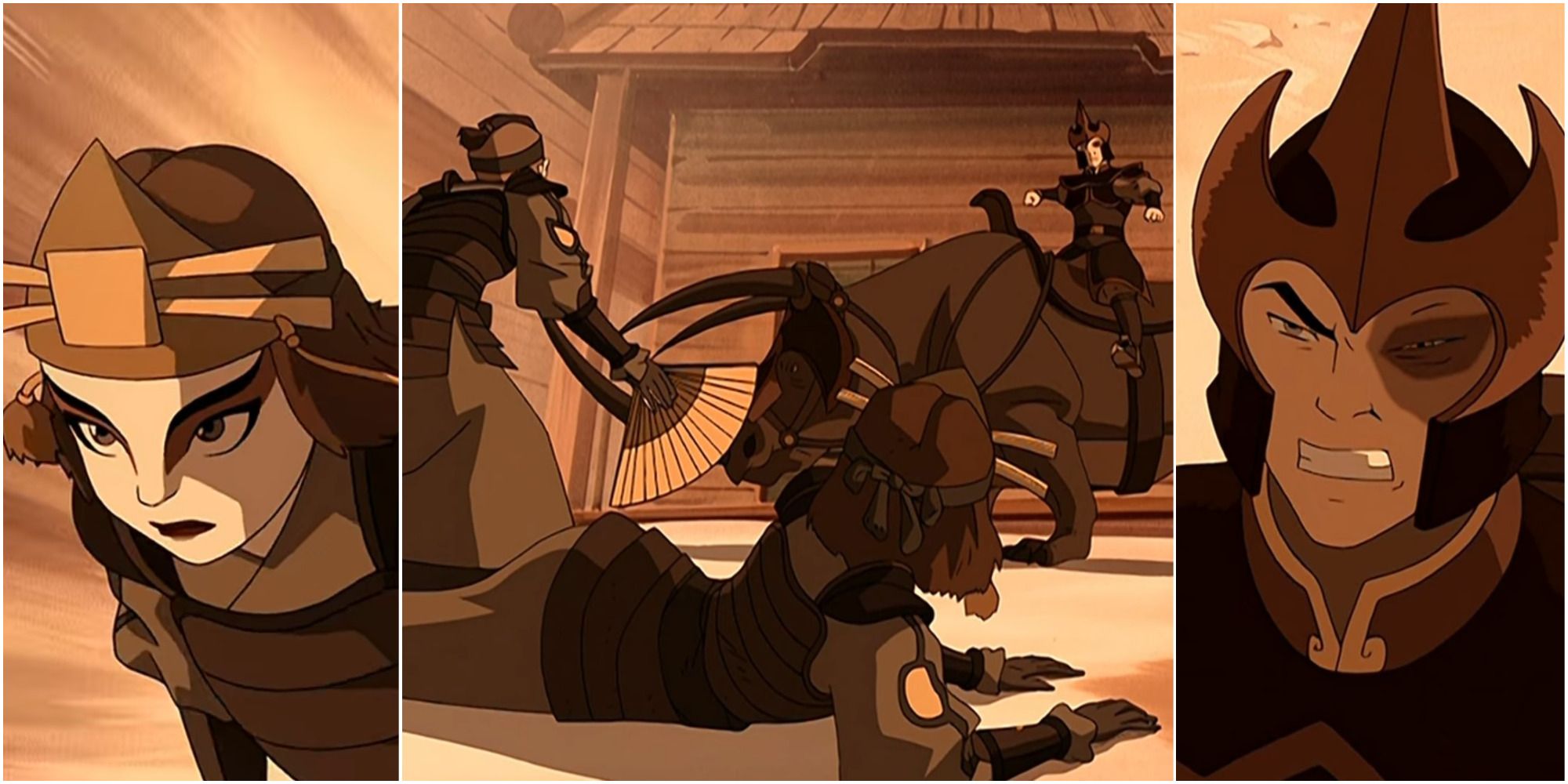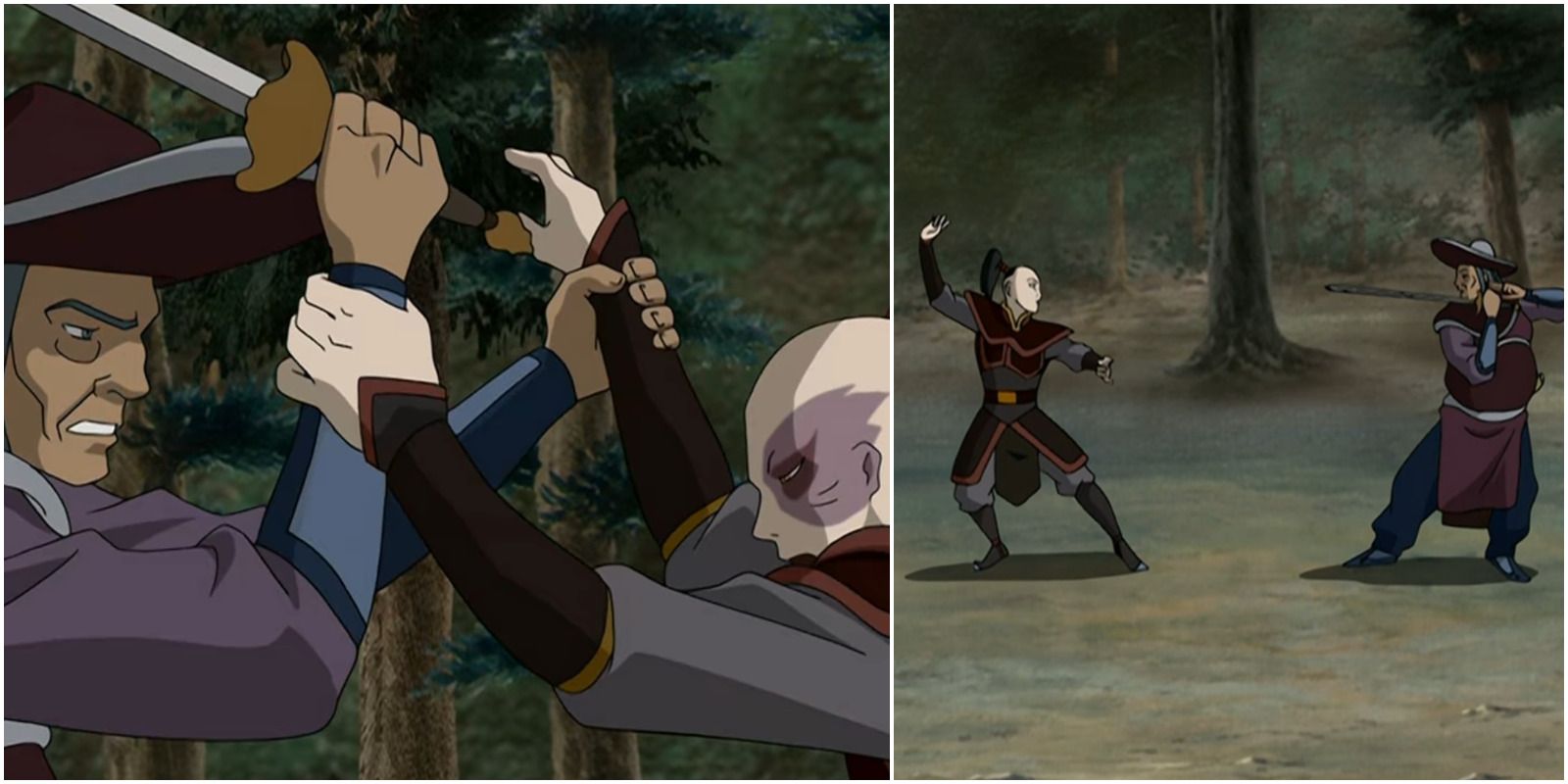 La destreza de Zuko en el combate también es una mezcla. Mientras que derrota a los guerreros titulares, incluyendo a su lÃder Suki, con su caracterÃstica patada giratoria para controlar el fuego, se queda corto al lado de Aang.