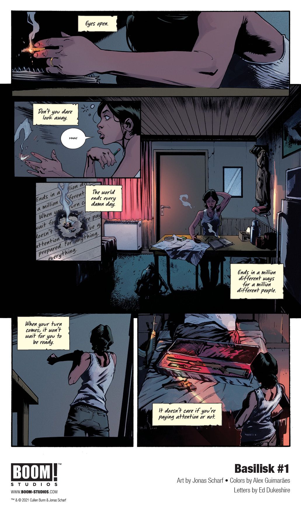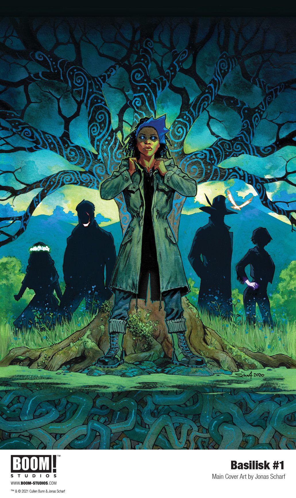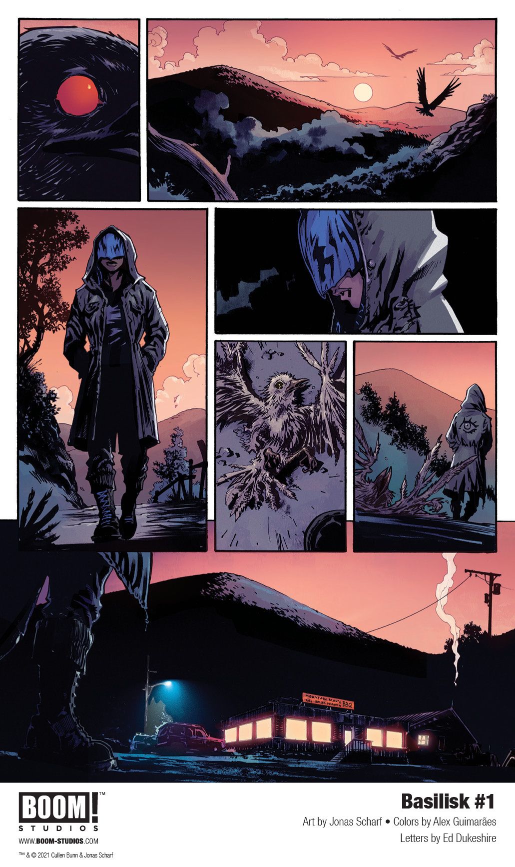 Basilisk nº 1 es obra del escritor de terror superventas del New York Times Cullen Bunn (Harrow County), el artista Jonas Scharf (Avengers of the Wasteland), el colorista Alex Guimarães y el dibujante Ed Dukeshire. El avance exclusivo de CBR del primer número presenta a Regan, una de las cinco Quimeras que se separó de sus hermanos y hermanas para esconderse. Sin embargo, incluso con los ojos de Regan cubiertos para evitar que sus poderes maten a cualquier persona o cosa en su camino, los pájaros aleatorios que vuelan en el aire siguen siendo víctimas de ella.