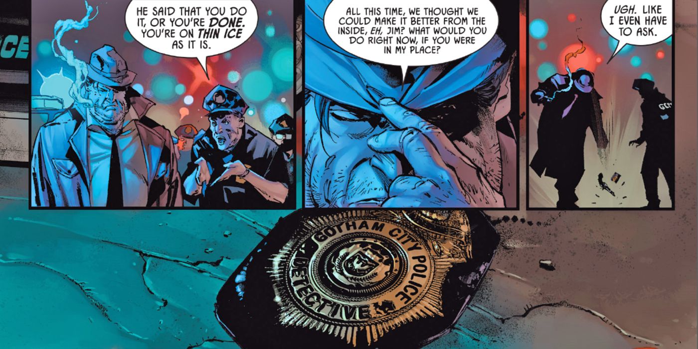 Ciudad Gótica siempre ha sido conocida por su corrupción y excesiva brutalidad policial. Batman militarizó a la policía con muchas de sus propias marcas de armas. Cuando el Guasón se apoderó de Ciudad Gótica en la Guerra del Guasón, tuvo a la policía trabajando a su lado para brutalizar a la gente. Y cuando la guerra terminó, esos policías siguieron brutalizando a la gente como siempre lo han hecho, pero ahora los ciudadanos de Ciudad Gótica sabían de dónde sacaban las armas los policías.
