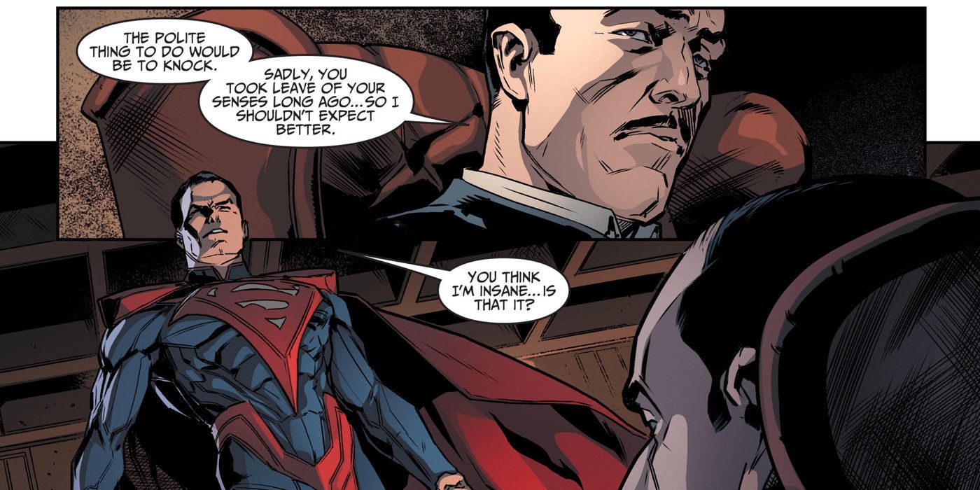 Esto causó que Superman comenzara a vigilar el planeta de manera similar a un dictador, no muy pronto después de matar al Guasón. Pero durante todo su gobierno, Alfred fue una voz constante de protesta, no temiendo regañar al kriptoniano e incluso dándole una paliza cuando le rompió la espalda a Batman.