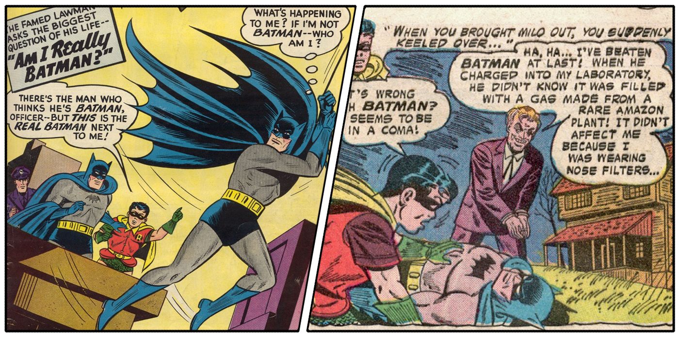 En "Am I ReallyBatman " de Batman #112, Batman casi perdió la cabeza cuando vio a otro Batman y a Bruce Wayne en la ciudad, lo que le hizo dudar de sí mismo. Más tarde se reveló que había sido envenenado por el profesor Milo, lo que podría haber acabado con Batman, por lo que le implantó un seguro hipnótico para evitarlo en el futuro.