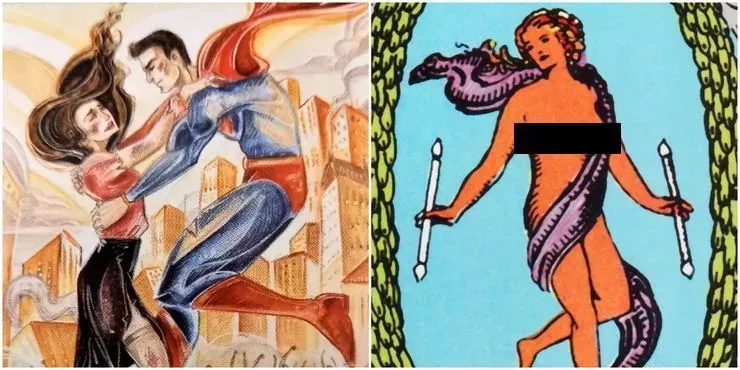 La carta del mundo trata de la culminación y la realización, y la representación de Superman y Lois -posiblemente la pareja más icónica de DC- juntos después de que Superman haya salvado la vida de ella no sólo apunta a su acoplamiento, sino también al estatus de Superman como el superhéroe definitivo de DC.