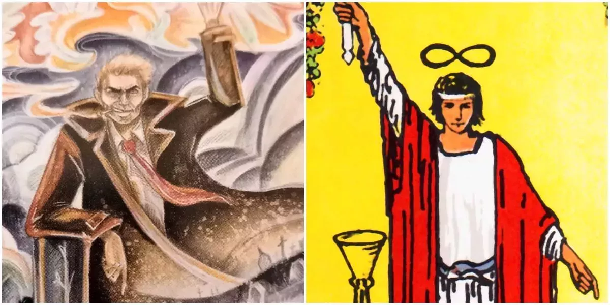 La representación que hace Richard de John Constantine como el Mago sigue la imagen original de Smith de El Mago apuntando con una mano hacia el cielo mientras sostiene una varita y con la otra hacia el suelo para simbolizar el puente entre los mundos natural y sobrenatural. Constantino encarna en gran medida este simbolismo, pero Richard introduce un poco de descaro al tener una cerilla para su cigarrillo en la mano apuntando hacia arriba y la otra mano apuntando directamente a una tumba. El mago representa el ingenio, que Constantino encarna plenamente.