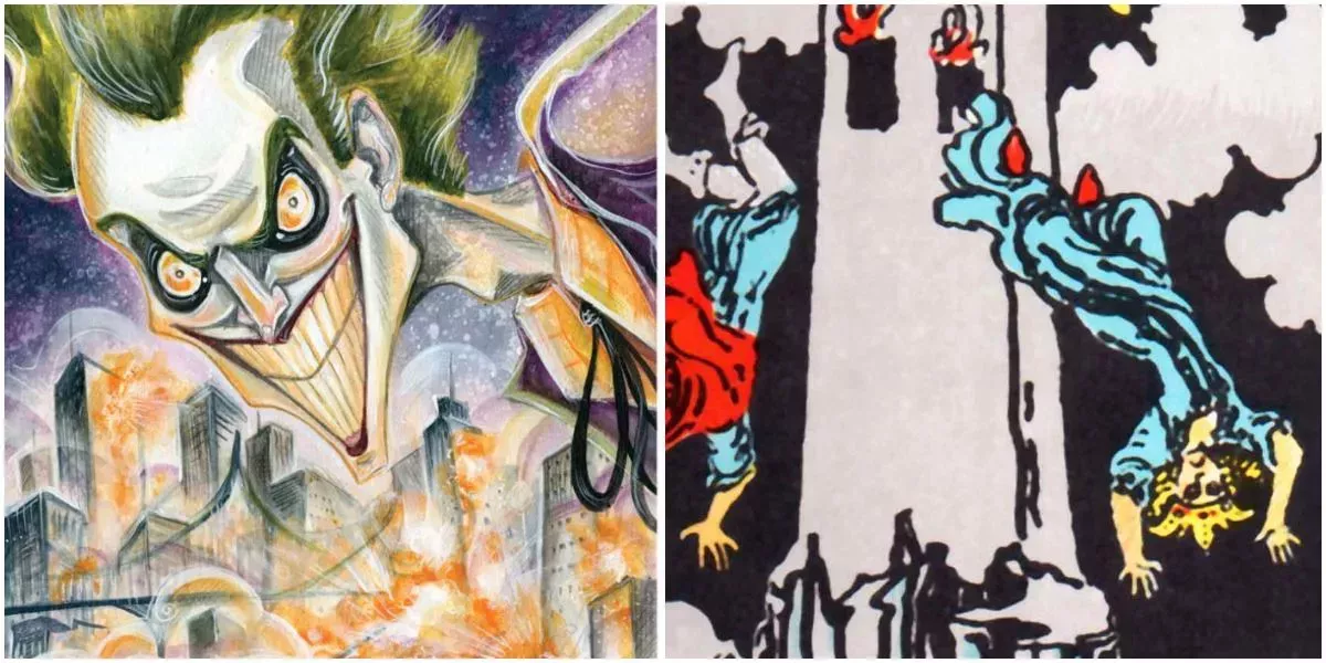 Cuando se trata de elegir una carta del tarot para representar al Joker, la Torre es la única opción que existe. Mientras que la obra de Smith muestra una torre que es golpeada y demolida mientras una persona cae de ella, el arte de Richard tiene al Joker en primer plano chasqueando los dedos y una ciudad en el fondo explota. La carta de la torre representa el caos, la catástrofe y la agitación. Independientemente de la versión del Joker que haya, estas tres caracterÃsticas pueden describir fácilmente al PrÃncipe Payaso del Crimen.