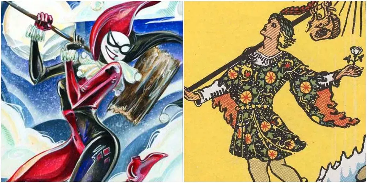 La primera carta de la baraja de tarot Rider-Waite-Smith es El Loco, que es esencialmente el protagonista de la baraja. El Loco representa la inexperiencia y el potencial y es un soñador que quiere más de lo que tiene, caracterÃsticas similares a la querida Harley Quinn de DC.
