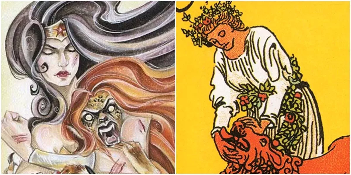 La carta de la Fuerza describe perfectamente a la Mujer Maravilla, ya que es una carta que equilibra fuerzas opuestas, como la propia Amazona, que es simultáneamente una guerrera y una diplomática. El significado adivinatorio de la Fuerza incluye el amor que triunfa sobre el odio, un tema que es constante en las historias de Wonder Woman.