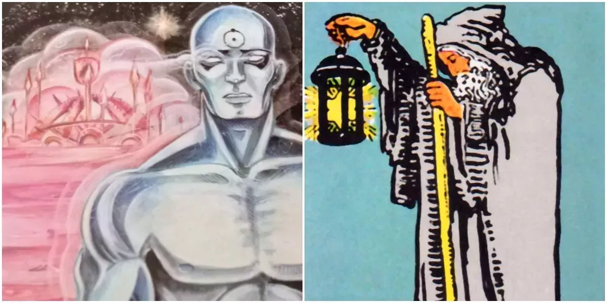 El Dr. Manhatten de Watchmen es lo más parecido a El Ermitaño que cualquier personaje de DC podrÃa tener. El Ermitaño es un hombre solitario que se ha aislado del mundo para aprender la sabidurÃa que eventualmente compartirá con aquellos que la buscan. Las palabras clave de adivinación que describen tanto al Ermitaño como al Dr. Manhatten son introspección, autorreflexión, soledad y alejamiento de la sociedad, que son todas partes del arco de Manhatten a través de la serie original de Watchmen e incluso de la más reciente Doomsday Clock.