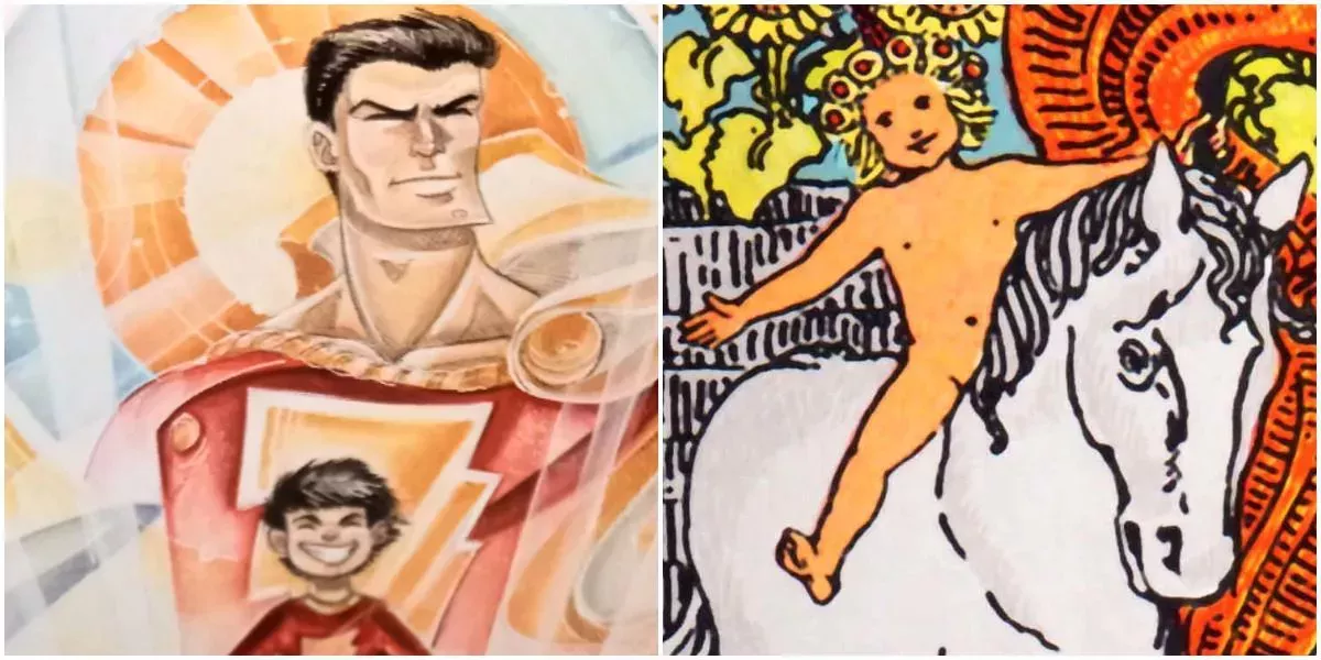 A menudo considerada la mejor carta de toda la baraja de tarot, El Sol representa todo lo bueno de la vida y de la vida, asà como el "perfecto control entre el consciente y el inconsciente", algo con lo que Shazam y Billy Batson pueden relacionarse al 100%. Incluso cuando se mira la carta del Sol invertida (su lectura cuando se tira al revés), la carta sigue siendo precisa para Shazam! ya que un Sol invertido simboliza el niño interior y el eterno optimismo. El número 19 también está asociado a la mitologÃa, la raÃz de los poderes de Shazam.