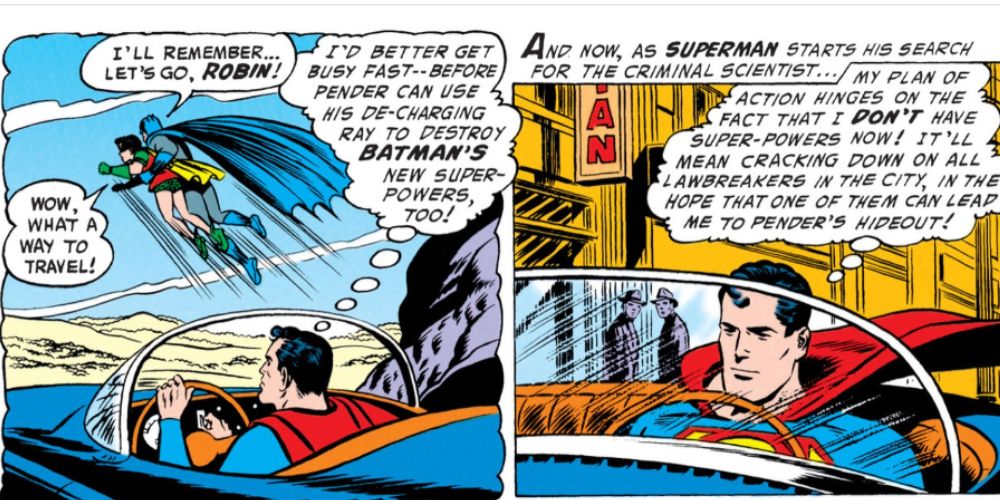 En ese momento, Batman entró a la fuerza y fue golpeado por el rayo. Ahora, Batman tenía los poderes de Superman y Superman era impotente. Por suerte, el cambio sólo dura 24 horas, pero Batman aprovechó el tiempo para sacar el máximo provecho llevando a Robin mientras volaba y haciendo que Superman los siguiera en el Batmóvil.