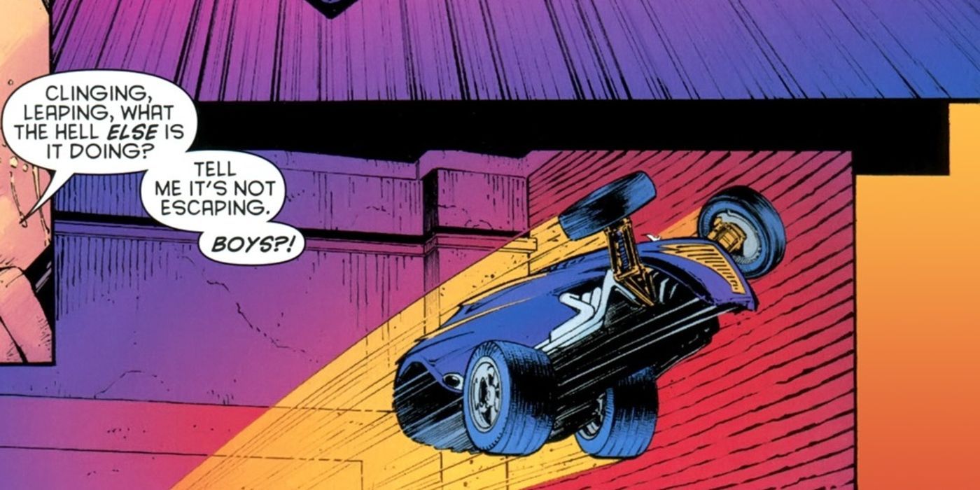 Todo parece perdido durante cierto momento claustrofóbico en el arco de la "Ciudad Oscura" del Año Cero. Batman está atrapado dentro de un túnel, incapaz de ir a ninguna parte ahora que la policía lo tiene acorralado. Pero entonces ocurre lo imposible: el Batmóvil se pega al techo del túnel como un murciélago y Batman escapa de las garras de la policía de la forma más espectacular.