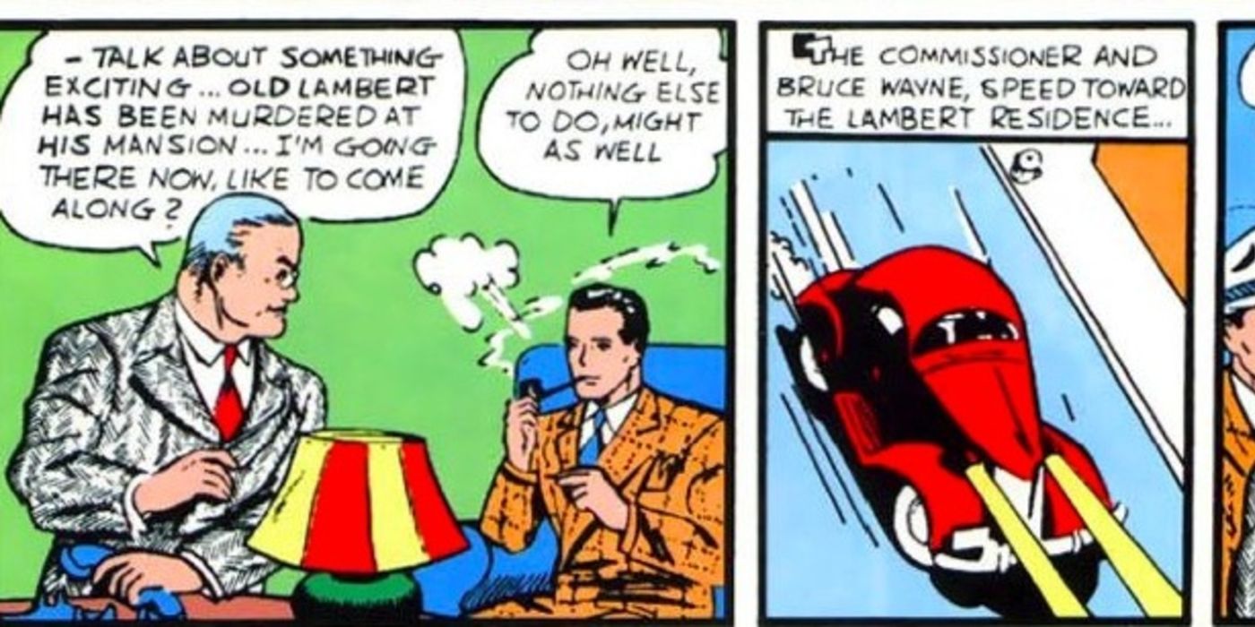 En la primera historia de Batman, "El Caso del Sindicato Químico", el coche que Bruce conduce como Batman parece ser el mismo que conduce en su vida pública. Es un coche rojo anodino, nada parece ser especial. Todo lo que hace es ayudar a Bruce/batman a viajar largas distancias.