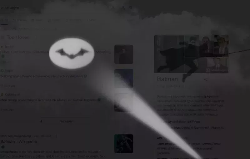 En la búsqueda de Google (escritorio o móvil), las búsquedas de "Bruce Wayne", "Gotham City" o "Bat-señal" mostrarán un icono amarillo animado de la Bat-señal. Haz clic en el icono y la pantalla se oscurecerá, mientras su famosa baliza convoca a Batman, que se balancea por la pantalla con un garfio.