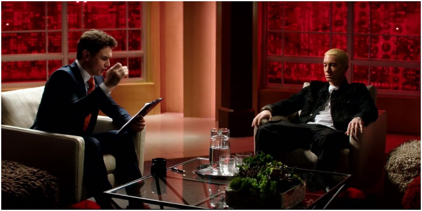 Eminem se enfrenta a esas críticas en The Interview, pero en lugar de ofrecer su habitual lengua mordaz, ofrece una versión de sí mismo que realmente es gay, saliendo del armario en televisión en directo ante el David Skylark de James Franco. La escena destaca a Skylark como un periodista con un don para conseguir las grandes primicias, y Eminem sugiere que cualquier letra gay suya era en realidad una alusión a su propia homosexualidad en el armario.