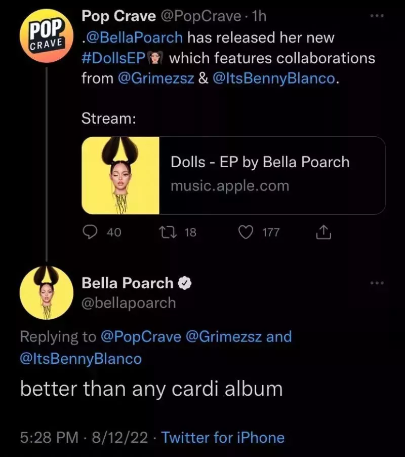 Ayer (12 de agosto), la cuenta de Twitter del sitio de noticias Pop Crave envió tweets sobre el EP de debut de Poarch, 'Dolls', que salió ese mismo día. A continuación, la propia cuenta de Poarch respondió con contundencia: "mejor que cualquier álbum de cardi".