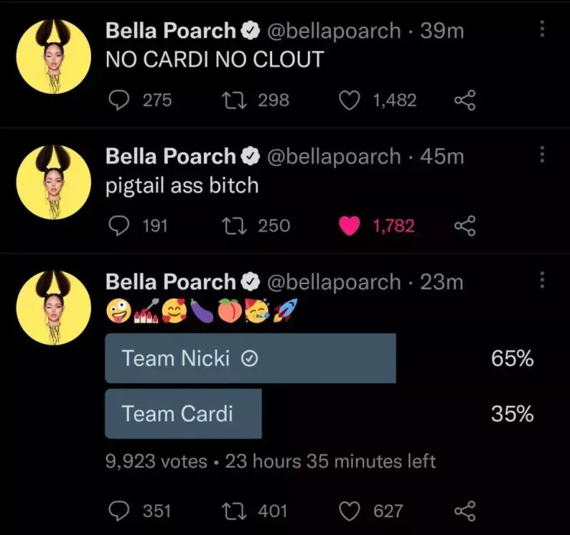 En la cuenta de Poarch se publicaron más tuits, desde entonces borrados, dirigidos a Cardi, incluyendo una encuesta que preguntaba si sus seguidores eran del "Equipo Nicki" o del "Equipo Cardi". Otro tuit insinuaba que Poarch carecía de la misma tracción que Cardi: "NO CARDI NO CLOUT", mientras que otro aparentemente la llamaba "perra con cola de cerdo".