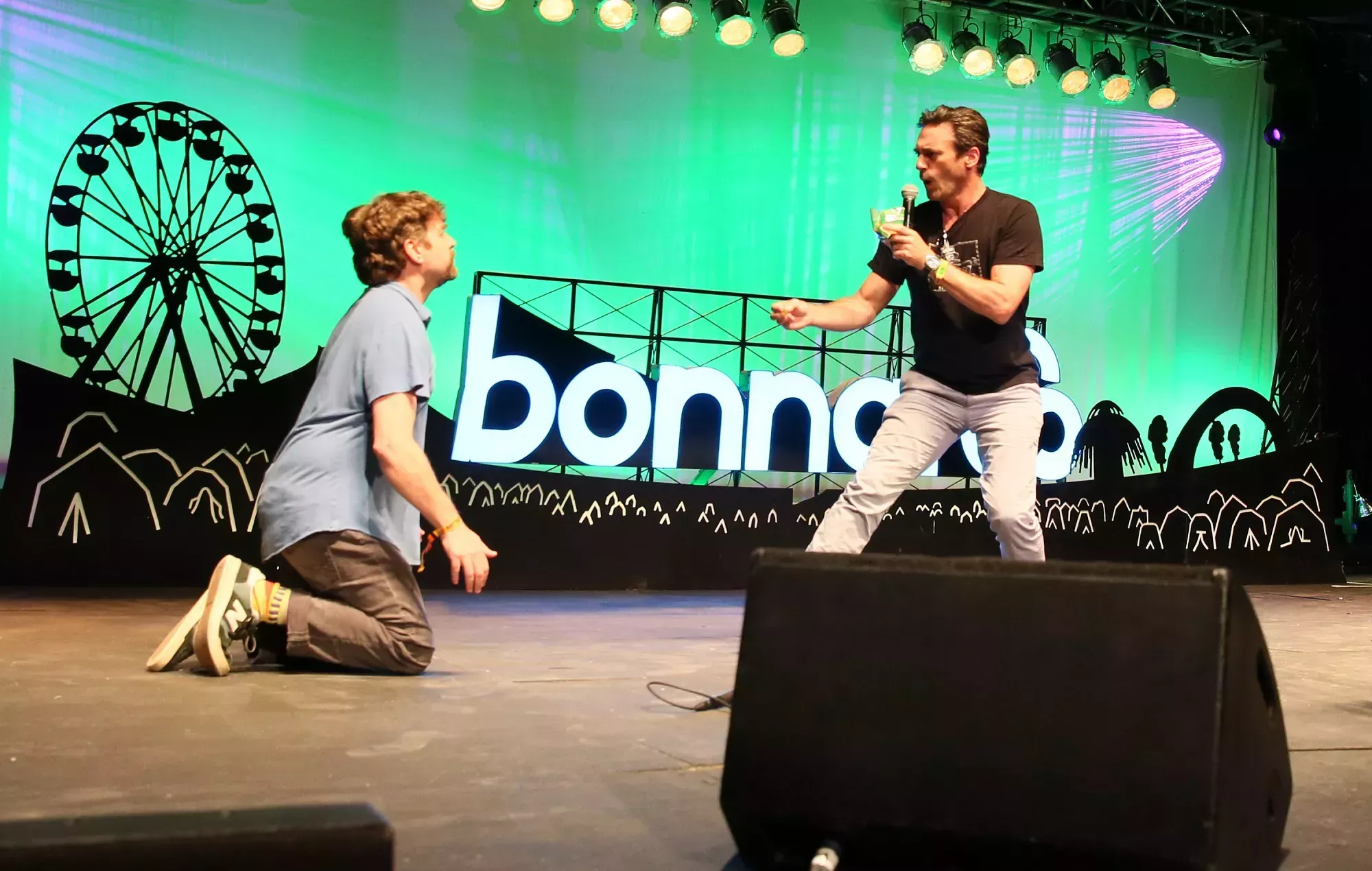 "En 2015, en Bonnaroo, Belle and Sebastian nos invitó a Zach Galifianakis y a mí a subir al escenario durante su actuación para lanzarnos ositos de goma a la boca. Luego [el líder] Stuart [Murdoch] se sumó a la diversión y exigió que también le atraparan", dijo Hamm.