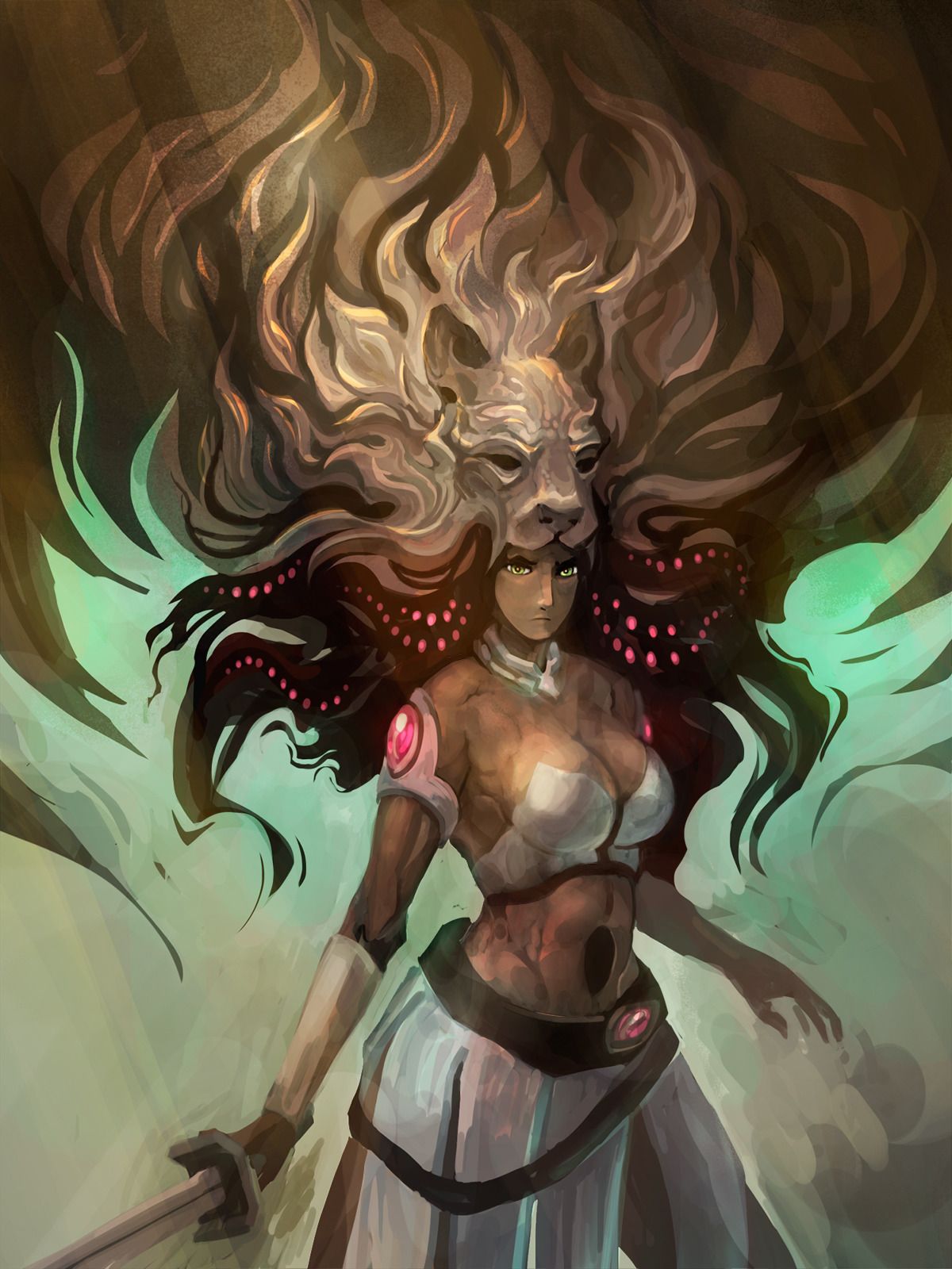 Este fan art tiene algo de "mítico" también, como si fuera una pintura que representara a un guerrero legendario. La cabeza del león casi parece ser un tocado (muy parecido a las leyendas que representan a Hércules), sin embargo, la melena del león se mezcla casi sin problemas en su pelo como si fuera realmente su propio ser.