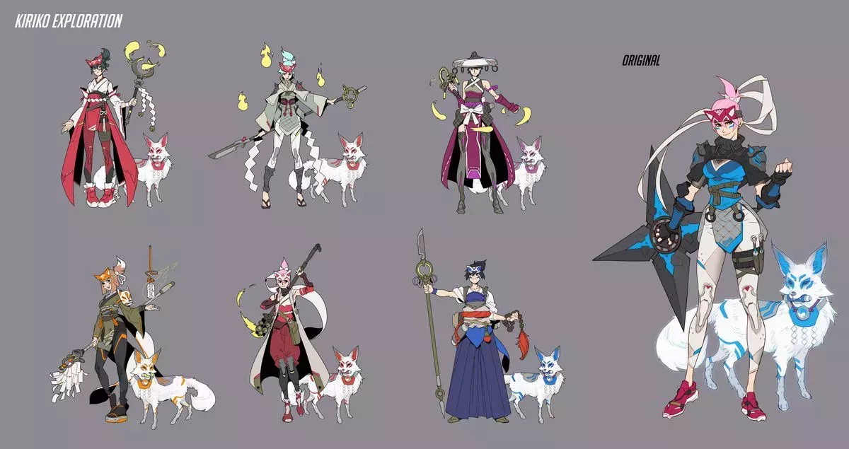Kiriko "empezó como una obra de arte muy chula que dibujó [el director artístico de personajes] Arnold [Tsang]", recuerda Noh. "Dibujó un montón de ninjas que podrían ser enemigos. Y nos quedamos en plan. Noh dijo que el espíritu de zorro de Kiriko era originalmente "una especie de clase de mascota en un MMO y te sigue" curando a tus compañeros de equipo. Pero esa idea resultó demasiado difícil de implementar, y finalmente se convirtió en la habilidad definitiva de Kiriko, Kitsune Rush, que presentó sus propios desafíos técnicos.