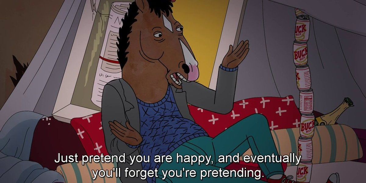 Aunque se sabe que no es buena idea fingir lo que uno siente, ésta puede ser una buena manera de afrontar una profunda tristeza. O al menos así es como se siente Bojack, y ya sabes, es un dechado de un paisaje mental positivo.