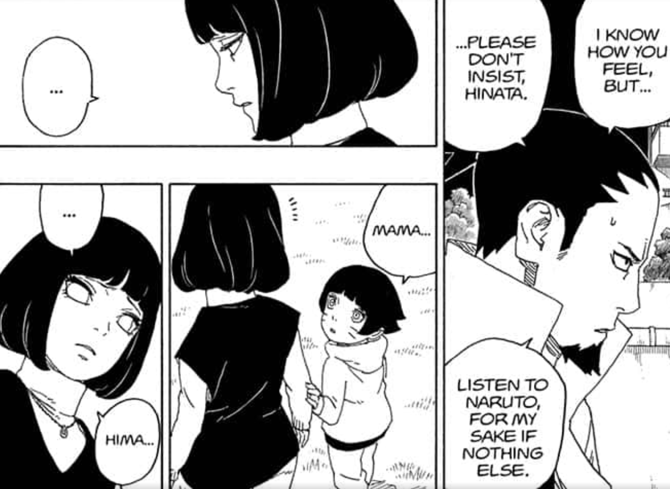 El problema es que Naruto rechaza la petición de Hinata de unirse a la cacería. Ella exige ir a buscar a su chico, pero Naruto le explica por qué no puede ir. Es peligroso a sus ojos, pero Hinata se ha enfrentado a los Akatsuki, así como a muchos guerreros Ōtsutsuki en su tiempo. Incluso en las películas de Naruto, demostró ser una luchadora capaz y una verdadera representante del clan Hyūga, por lo que Hinata habría sido ideal para luchar contra Code.