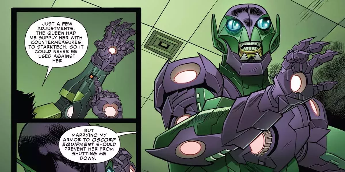 Aunque la fórmula del Duende funcionó, tuvo el desafortunado efecto secundario de volver loco poco a poco a Tony. Tomó las armas y el traje del Duende de Norman para sí mismo, alterando significativamente su armadura. Al final, incluso Stark se dio cuenta de lo que la fórmula le estaba haciendo. En lugar de perderse por completo, optó por intentar redimirse de sus acciones de villano en un resplandor de gloria para dejar escapar a Flash Thompson y a los demás y hacer un último intento de arreglarlo todo.