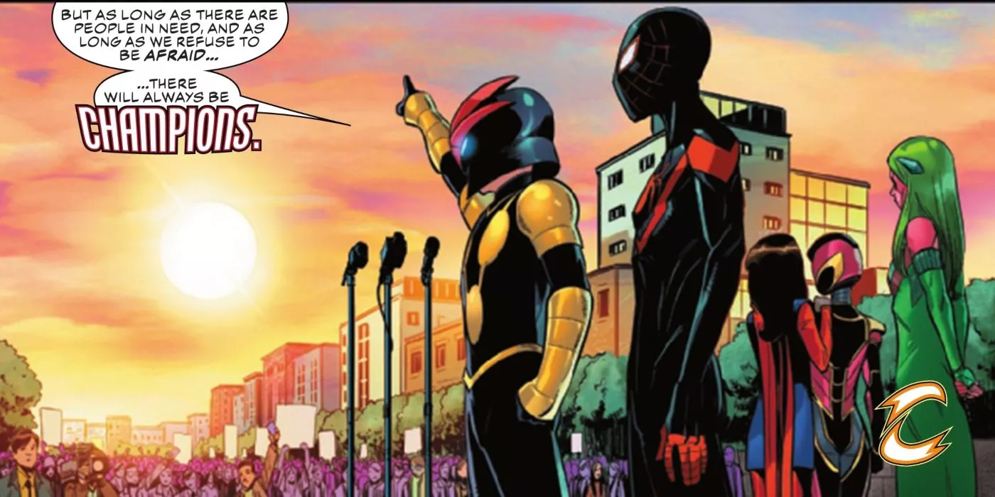 El final del número revela que Miles Morales y Sam Alexander, también conocidos como Spider-Man y Nova, han sido enviados para infiltrarse en la empresa como nuevos becarios en su departamento de medios sociales. La empresa está encantada de tenerlos a su lado. Es muy poco probable que dos miembros fundadores de los Campeones se hayan vuelto completamente contra sus aliados. En cambio, es mucho más probable que la pareja se esté infiltrando en la empresa como parte de la próxima salva del equipo contra la corporación. Al infiltrarse en la compañía, los dos jóvenes héroes podrían ser cruciales para descubrir qué otros planes tiene Roxxon para el mundo y para tratar con jóvenes héroes como ellos.