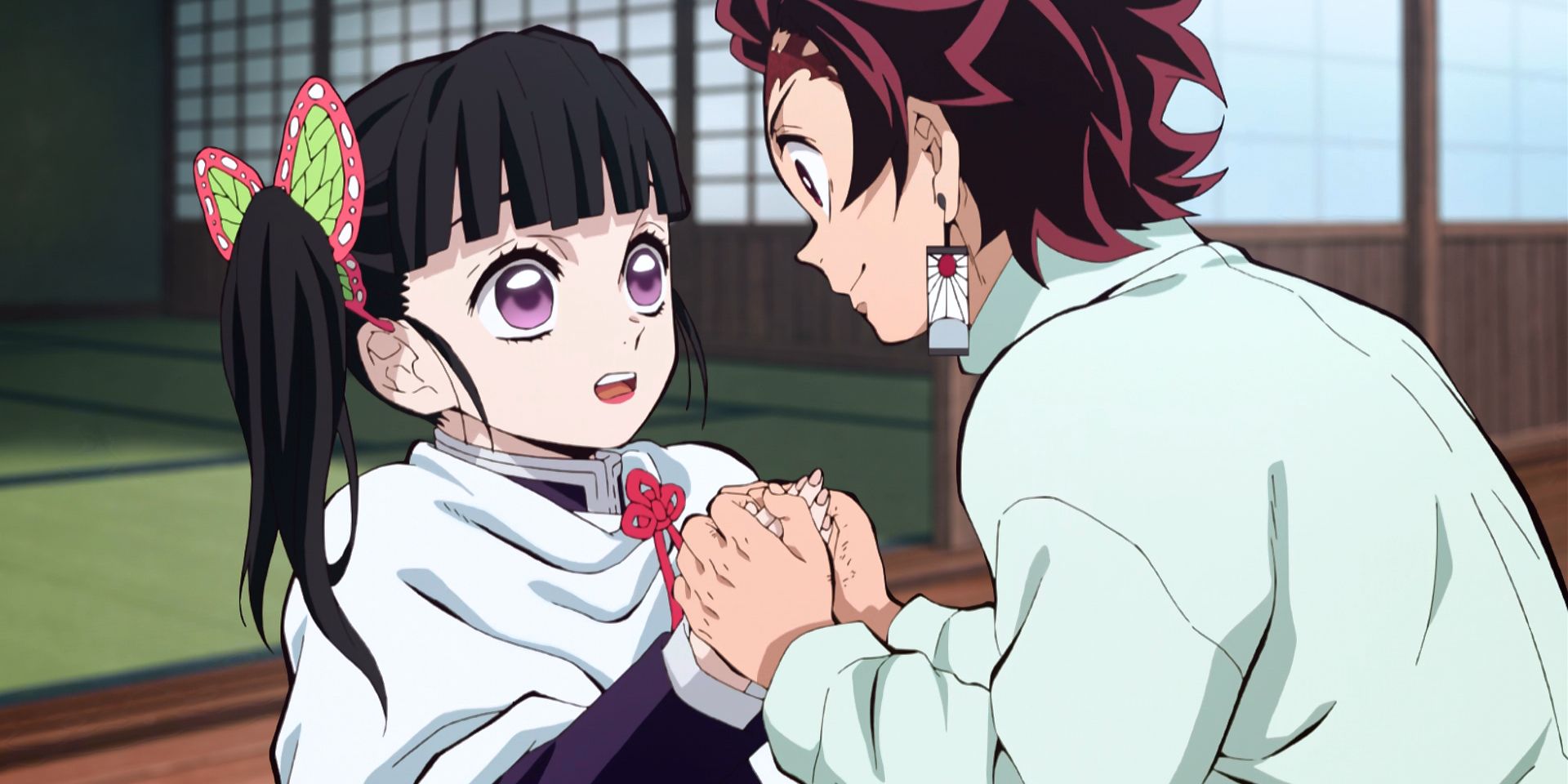 Shinobu ha desempeñado un papel en el entrenamiento de Tanjiro mientras éste se encuentra en una etapa de rehabilitación. Al principio, le cuesta entender su devoción por Nezuko, que al fin y al cabo es un demonio. Sin embargo, llega a sentir más afecto por él que por sus otros alumnos, y sus conversaciones revelan un estrecho vínculo. Cuando le dice a Oyakata-sama que Tanjiro está listo para la misión del Tren del Infinito, lo recomienda diciendo que "tiene un alma pura y es capaz de esforzarse a diario".