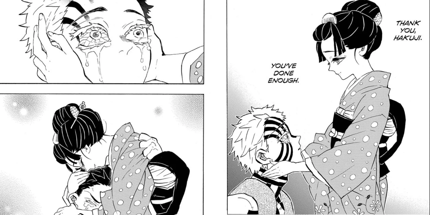 En los momentos finales de la pelea, Tanjiro siente la gratitud de Akaza mientras el Demonio se ataca a sí mismo, reconociendo su derrota. Mientras que Muzan insta a su lado demoníaco, Akaza finalmente escucha su humanidad y se encuentra con su padre, Keizo y Koyuki. Sin absolver sus malas acciones, sus seres queridos le dan la bienvenida a casa y aparecen para unirse a él en el infierno, con las llamas arremolinándose alrededor de un Akaza abrazador, ahora de nuevo Hakuji, y Koyuki mientras el cuerpo del demonio se desmorona.