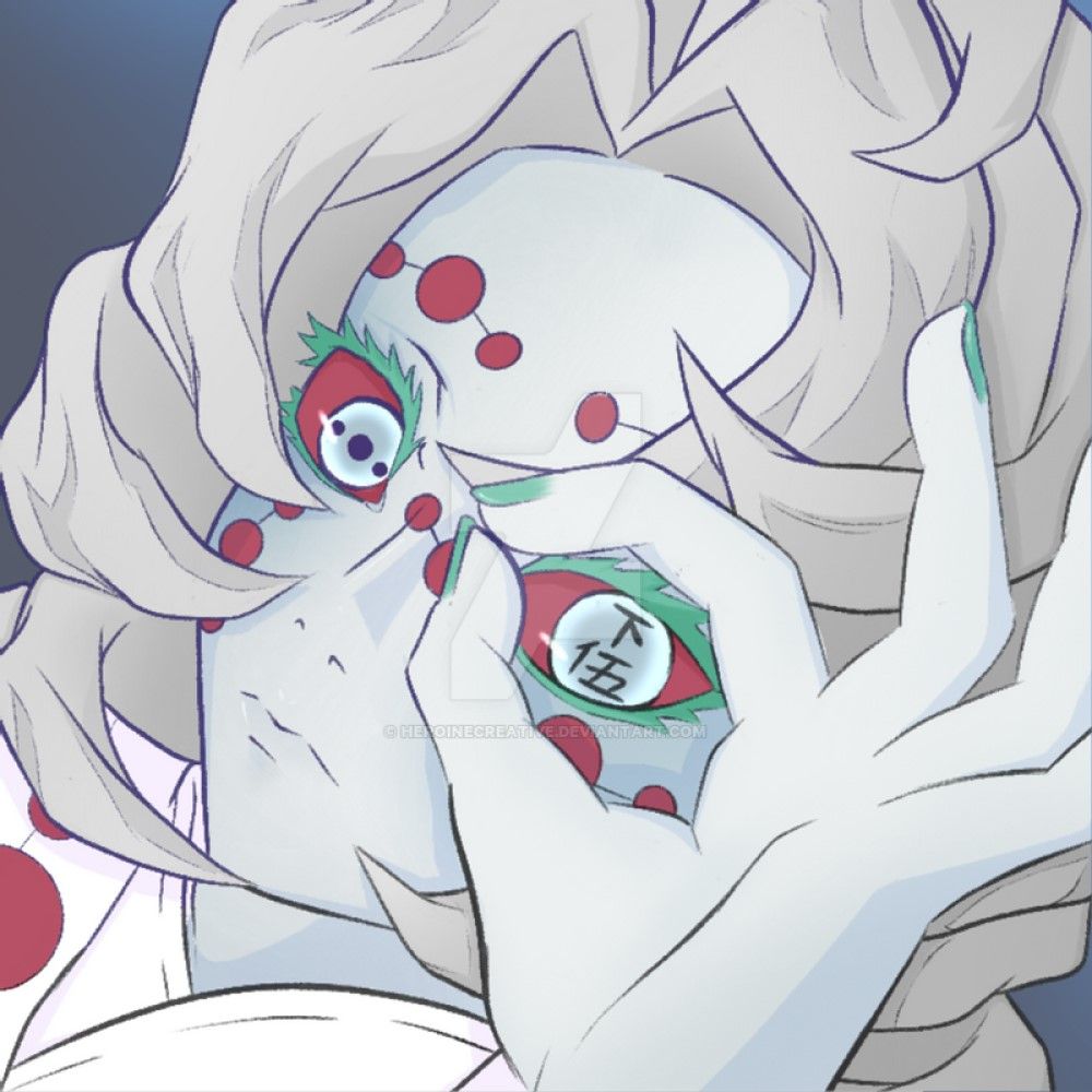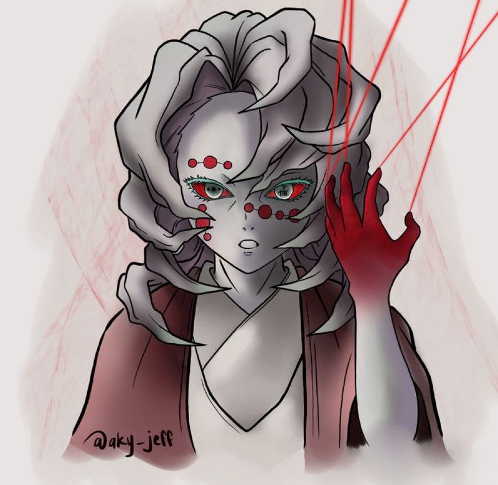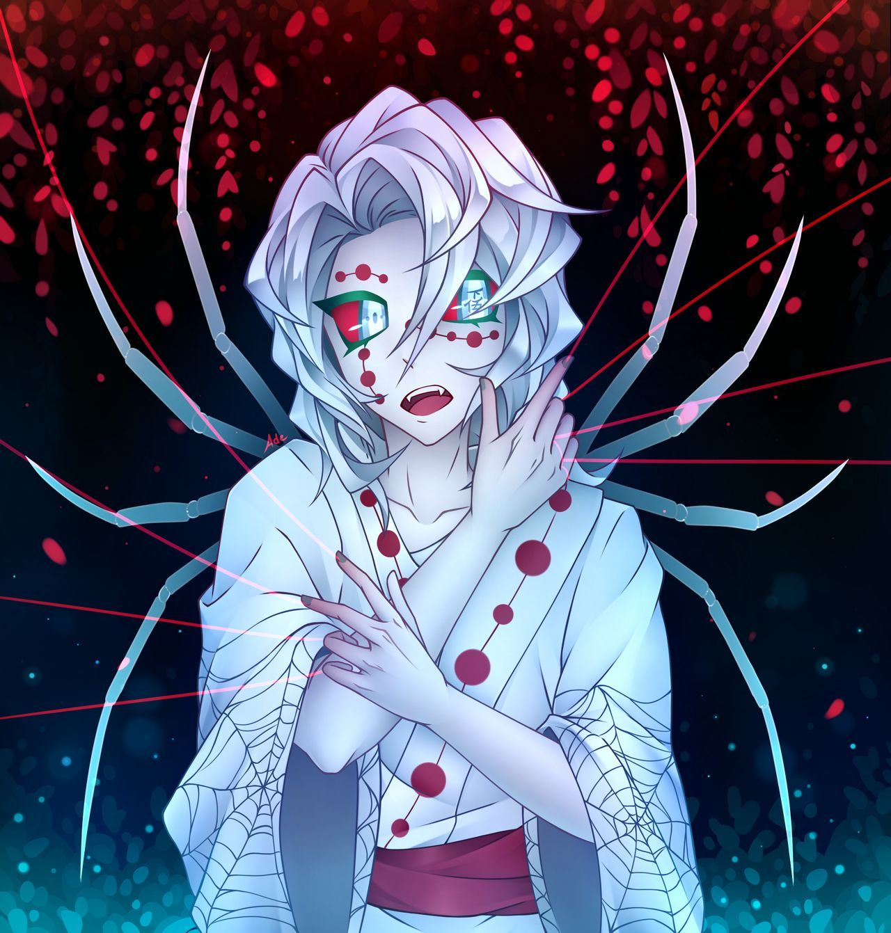 Imagina a Nezuko rechazándolo como hermano, Rui se prepara alegremente para castigarla por ello. La telaraña que lo rodea en el fondo sólo lleva ese punto más allá ya que ese era su principal medio de ataque.