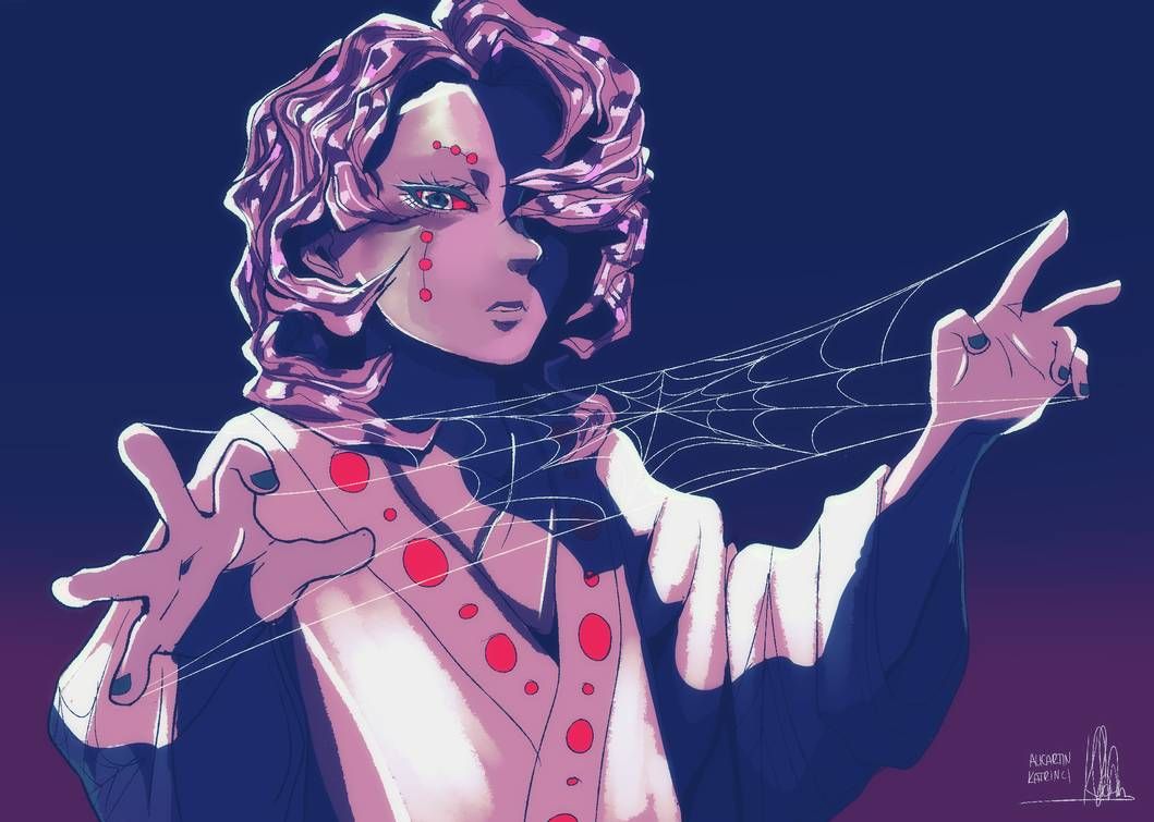 Mientras que el Padre Araña fue el único que asumió verdaderas cualidades de animal, Adeslowmoqueen decidió ir más allá con Rui también. Las patas que brotan de su espalda son casi translúcidas, se mezclan con el fondo tan bien que se podría pensar que son casi una aparición. Sus ojos son más prototípicos del estilo anime también, muy amplios y grandes, dándote una visión completa del intrincado diseño de sus ojos. Los colores son también tan brillantes y vívidos.