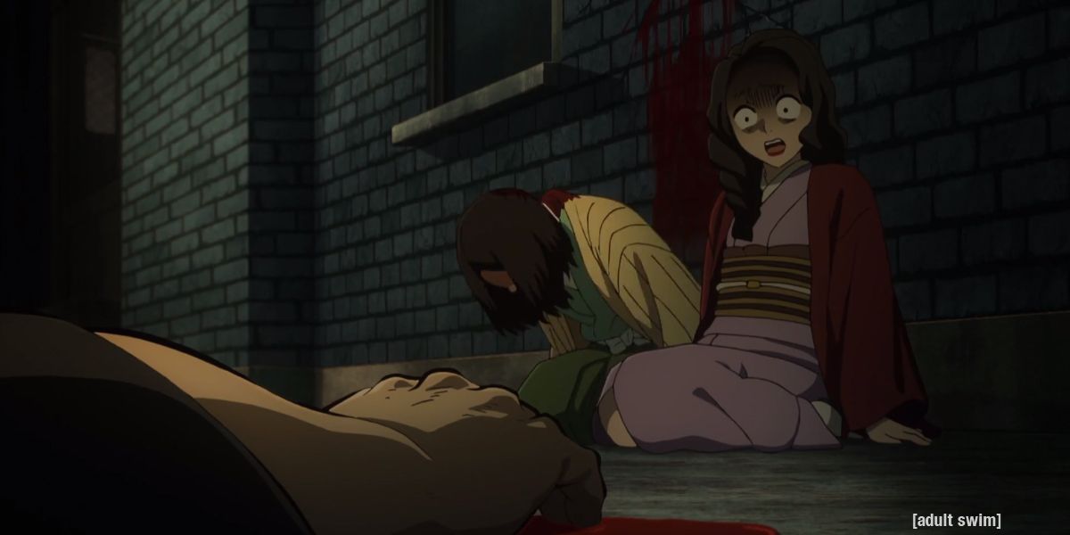 Masacra a ese hombre, y luego al que viene a defender a su amigo. Su amiga se acobarda en un rincón, y Muzan se acerca a ella, burlándose de ella. Entonces le da tanta sangre que ella se quema y estalla de adentro hacia afuera, aunque ella no haya dicho o hecho nada.