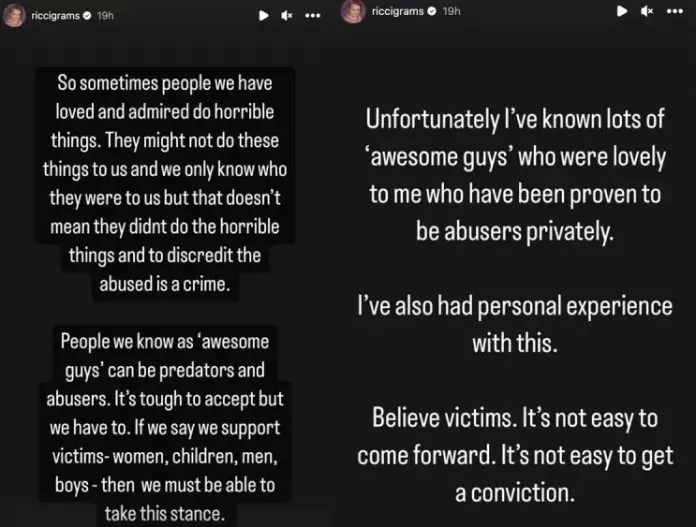 En su primer Instagram Story, publicado el 10 de septiembre, la estrella de la Familia Addams señaló que aunque la gente "podría no hacernos estas cosas", esto "no significa que no hayan hecho las cosas horribles". "Las personas que conocemos como 'tipos increíbles' pueden ser depredadores y abusadores", escribió. "Es difícil de aceptar, pero tenemos que hacerlo".