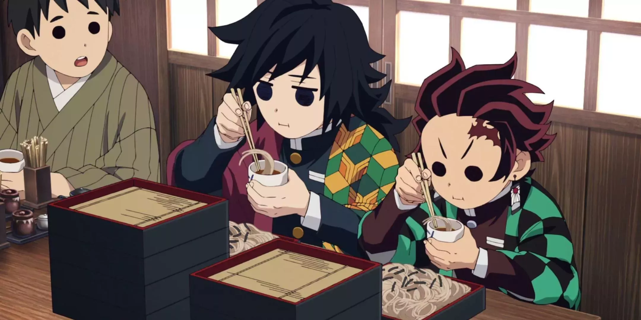 Tras un momento íntimo en el que Giyu revive algunos de sus traumas y recuerdos del pasado, transcurre un tiempo de silencio. En ese momento, Tanjiro, nervioso, decide que retar a Giyu a un concurso de comida es la única forma de conseguir que regrese, a pesar de que el Hashira del Agua ya ha tomado la decisión de volver. La sincera petición de Tanjiro de participar en un concurso de comida resulta entrañable y deliciosamente divertida, a la vez que refuerza la amistad entre estos dos espadachines que respiran agua.