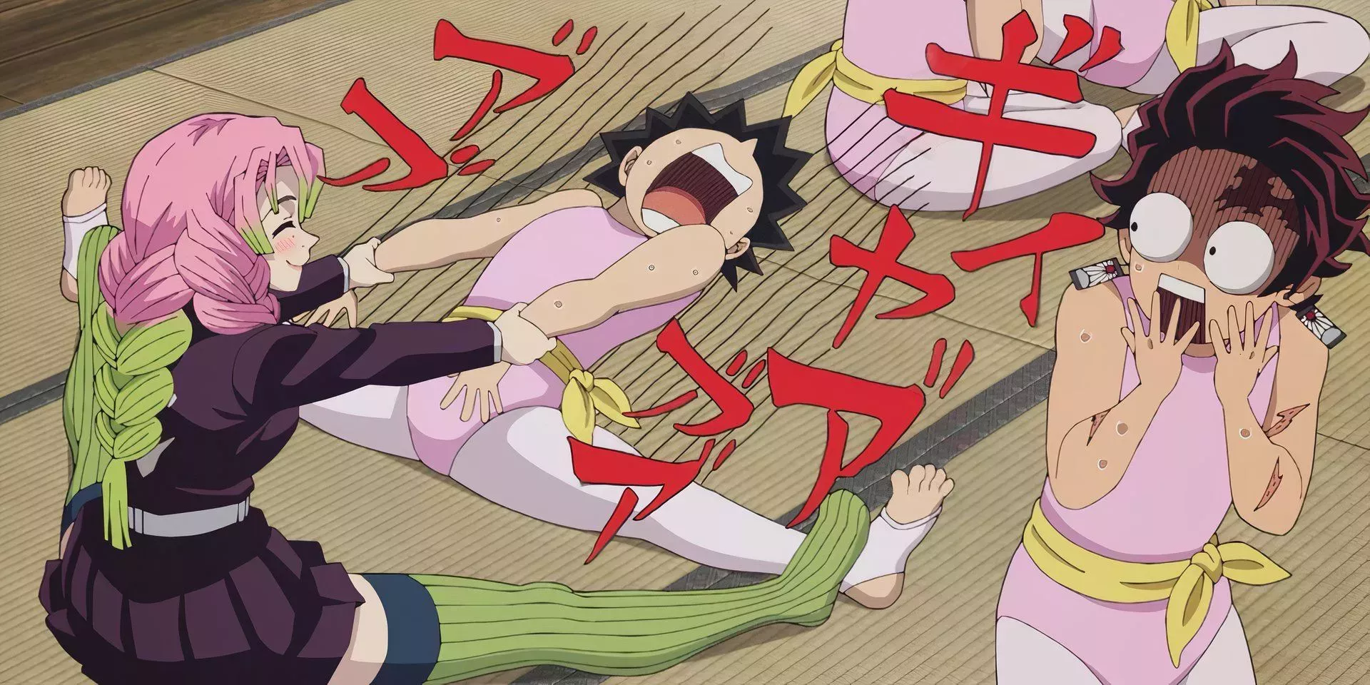 Cuando Tanjiro llega para su entrenamiento -y tras una rápida merienda con tortitas, mantequilla y sirope-, Mitsuri le da un suave leotardo rosa para que se cambie. Ver a Tanjiro de pie, orgulloso y emocionado, con sus mallas, mientras los demás aprendices parecen avergonzados, hace que esta escena resulte graciosa. Pero ver después cómo Mitsuri obliga a sus aprendices a hacer un corte muy brusco con las piernas hace que esta escena sea aún más deliciosa.