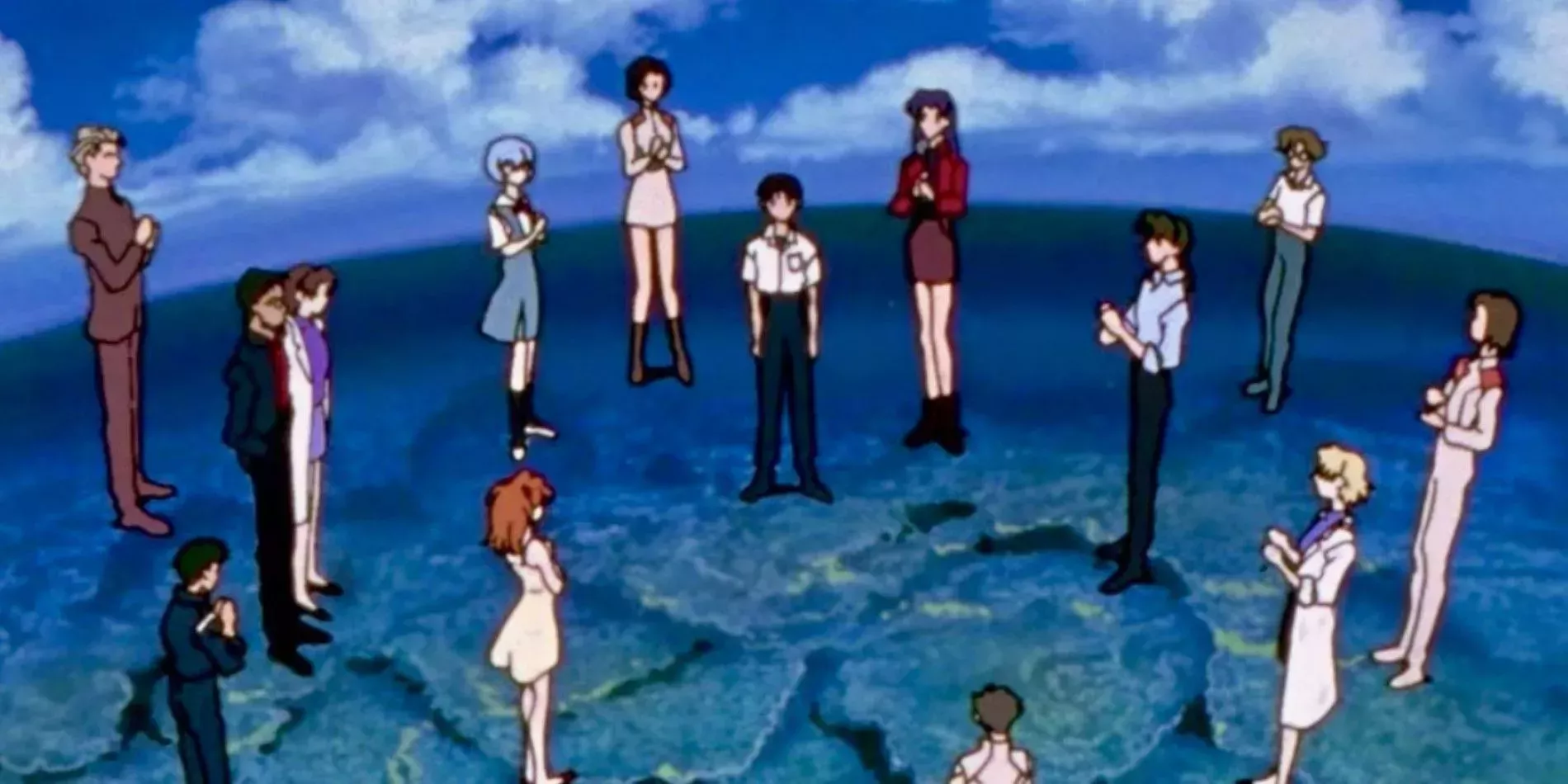 Evangelion termina de forma infame con una extraña secuencia en la que el protagonista, Shinji, se sienta solo, pensando en su vida, antes de tener una revelación. Esta revelación le envía a un lugar desconocido donde los demás personajes le rodean, aplaudiéndole y diciéndole "felicidades". Aunque hoy en día la gente lo considera con razón un clásico subversivo, los fans de la época odiaban este final, lo que hizo que Hideaki Anno recibiera amenazas de muerte y cartas airadas.