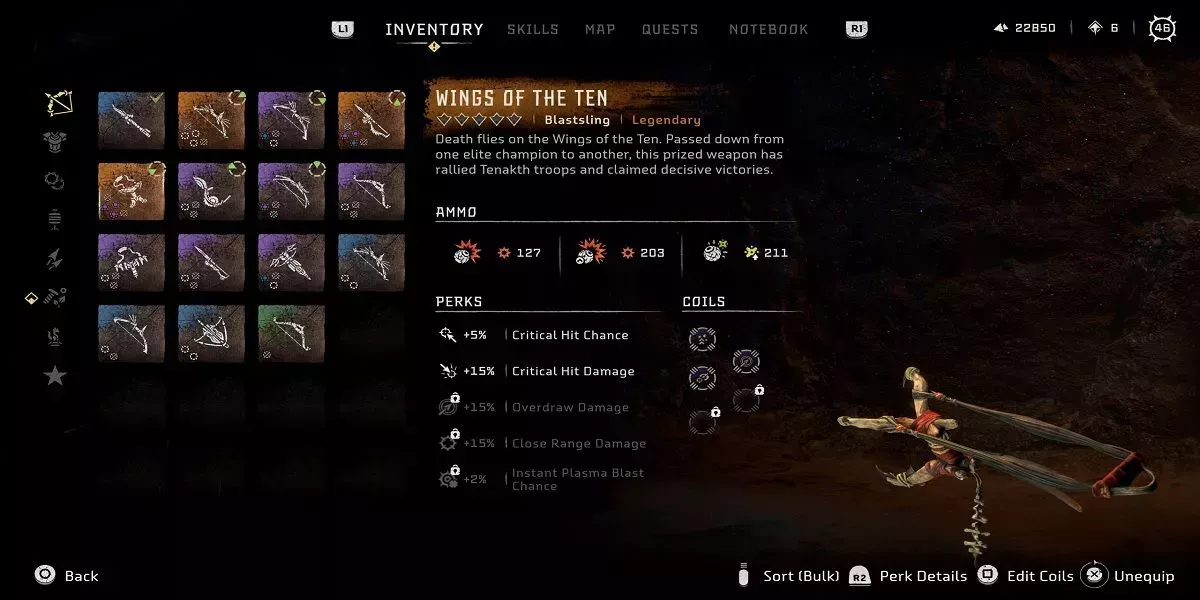 Al igual que muchos otros armamentos de Horizon Forbidden West, adquirir las Alas de los Diez lleva un poco de tiempo. Aun así, esta inversión de tiempo proporciona una recompensa inestimable a largo plazo. Las Alas de los Diez utilizan proyectiles explosivos para inmovilizar a los oponentes, incapacitándolos para actuar y, por tanto, facilitando su eliminación.