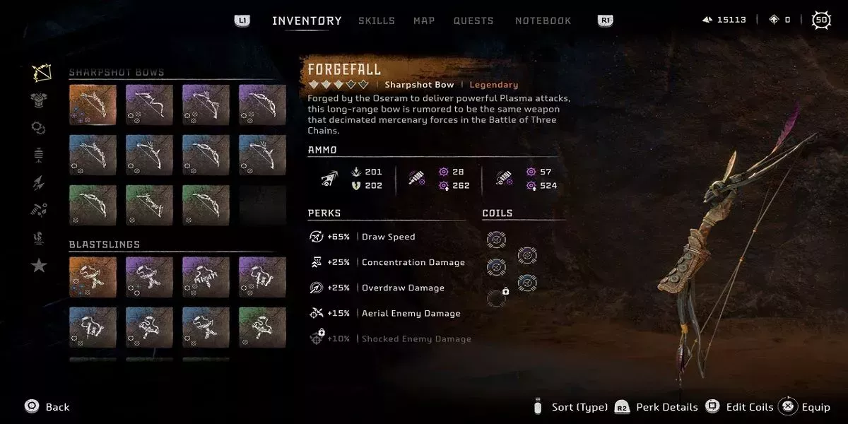 Aunque este coste parece desorbitado, el Forgefall vale cada segundo invertido. Muchos consideran este arco una de las mejores armas de largo alcance de todo el juego. No sólo puede infligir potentes ráfagas de daño de plasma, sino que también tiene flechas que penetran la armadura. Además, los jugadores pueden combinar estos dos efectos para obtener una ráfaga extra de potencia contra casi cualquier enemigo.