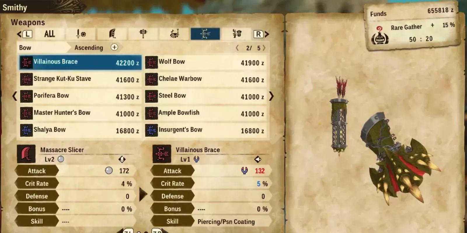 El Brazalete Villano tiene un Ãndice de ataque de 172, con un 4% de probabilidad de golpe crÃtico. Esto ya es una buena combinación, pero si le añadimos el revestimiento de veneno, resulta muy letal. El daño a lo largo del tiempo es una forma sólida de acabar con los enemigos rápidamente, y el Brazalete Villano es un arma fantástica que puede hacer exactamente eso.