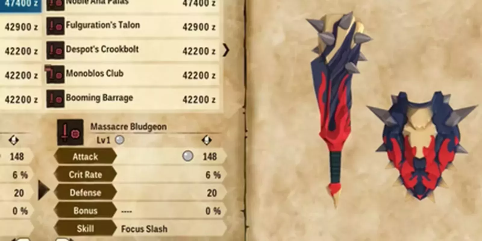 Derrotar a los Diablos del Baño de Sangre es la clave para conseguir los componentes de artesanÃa necesarios para esta arma. Con un Ãndice de ataque de 148 y un 6% de posibilidades de asestar golpes crÃticos, además de ofrecer un aumento de la defensa, la porra de masacre ya es una gran arma. Pero como inflige daño no elemental, los jugadores pueden estar tranquilos sabiendo que cada golpe va a herir a cualquier tipo de monstruo contra el que estén luchando.