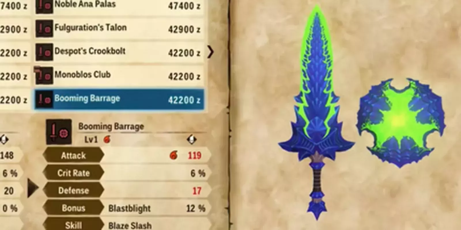 ¡La espada y el escudo vuelven a hacer acto de presencia! Con un nombre como Booming Barrage, esta arma hace honor a su estruendosa nomenclatura. Por suerte para los jugadores (y por desgracia para los monstruos), la Andanada retumbante es un tanque que deja estelas de destrucción a su paso. Los jugadores que tengan la paciencia suficiente para superar las batallas de Brachydios podrán conseguir los materiales necesarios para fabricarla.