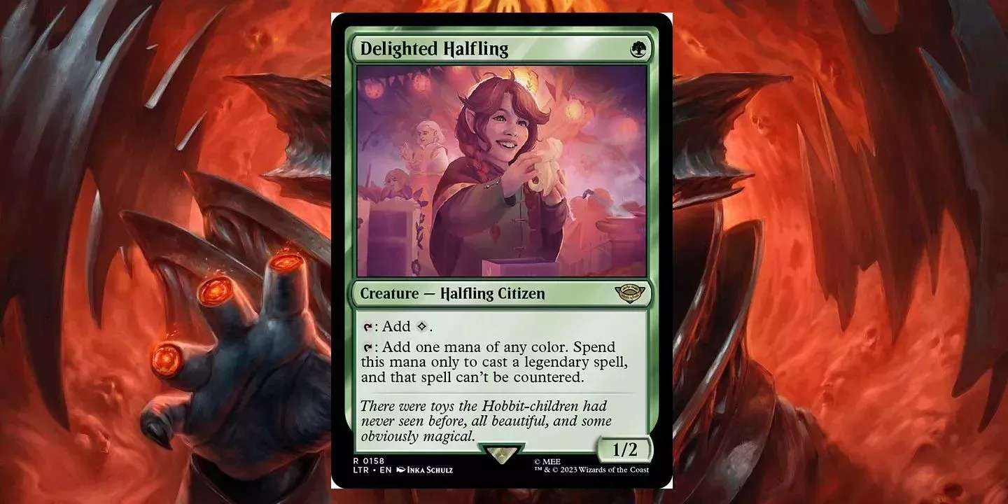 Delighted Halfing puede pedir un maná de cualquier color para lanzar un hechizo de criatura legendaria, y ese hechizo no puede ser contrarrestado. Es una forma estupenda de lanzar cualquier criatura legendaria y, para otros hechizos, Delighted Halfing puede simplemente pedir un maná incoloro, por lo que no está limitado a lanzar criaturas legendarias.