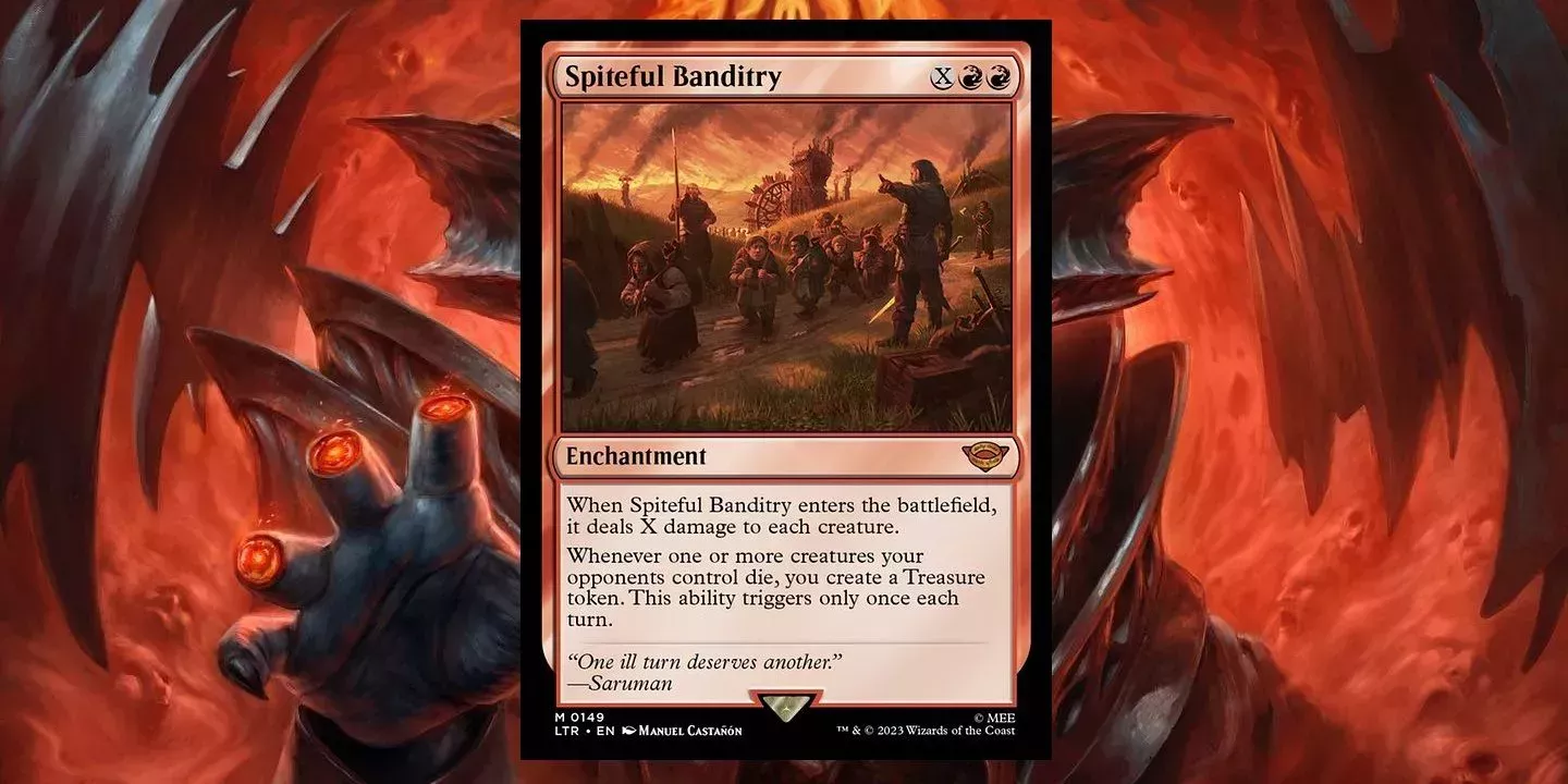Bandidaje malicioso es una carta de encantamiento roja, rara y mÃtica, que sirve para limpiar el tablero cuando entra en el campo de batalla. Bandidaje rencoroso infligirá X puntos de daño a todas las criaturas, lo que puede arrasar el tablero fácilmente si el lanzador tiene suficiente rampa de maná para pagar mucho por este encantamiento rojo.