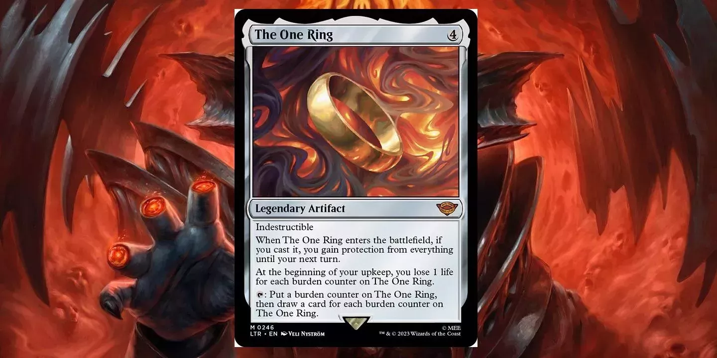 El Anillo Único es un objeto mágico legendario y asombroso que puede cambiar el juego en MTG. Lanzarlo es como la Protección de Teferi, que protege al jugador de todo hasta su siguiente turno para representar a un portador del Anillo que se vuelve invisible mientras lo lleva.