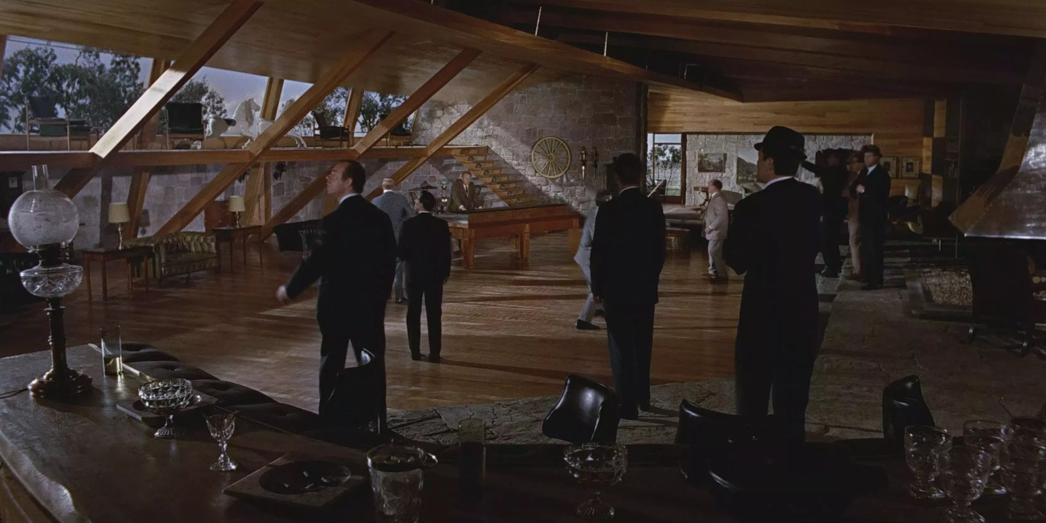 1Auric Goldfinger, el villano de la película de 1964, es un hombre de gustos caros. Su salón en su yeguada de Kentucky lo refleja, con madera noble de pared a pared, una maqueta oculta de Fort Knox y una mesa de billar que se gira para mostrar un amplio panel de control. Goldfinger es también un hombre fascinado por la cultura americana, como indica la decoración kitsch de inspiración campestre del salón. Las ruedas de los carros y las esculturas de caballos pueden parecer fuera de lugar en la guarida de otro villano, pero aquí encajan a la perfección.