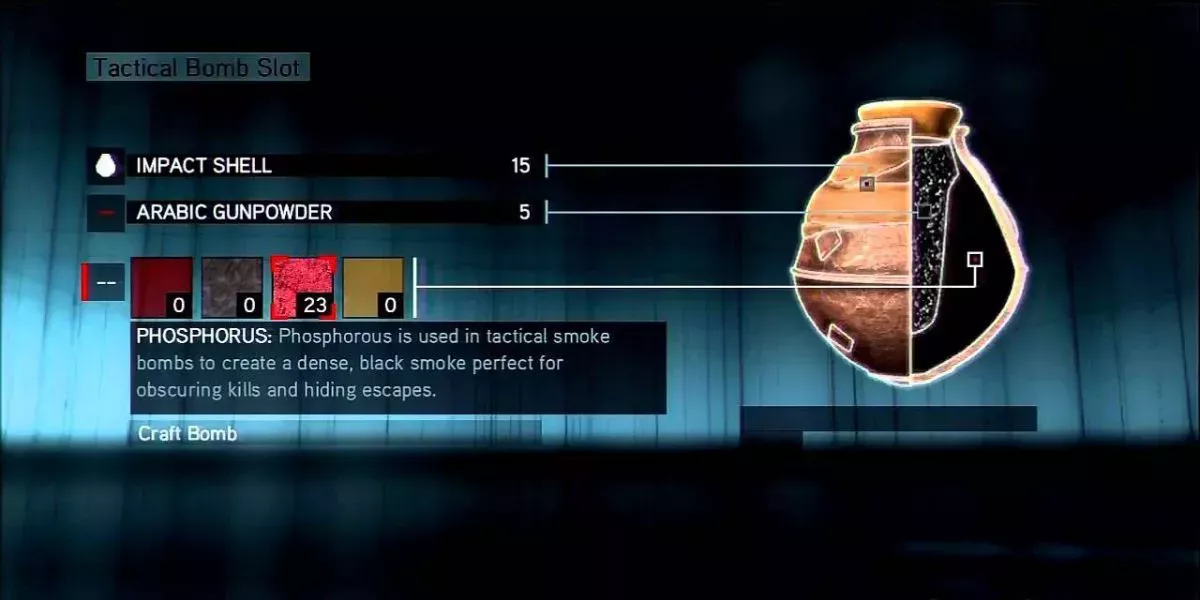 Las bombas de humo pueden dar cobertura al jugador para escapar o darle ventaja en el combate. Una de las mejores caracterÃsticas de la bomba es que puede lanzarse a gran distancia. Esto permite a los Assassins astutos crear un velo de oscuridad sobre un objetivo lejano y su séquito. Entonces pueden abalanzarse sobre el objetivo, ejecutarlo y retirarse rápidamente a un escondite antes de que se disipe el humo.