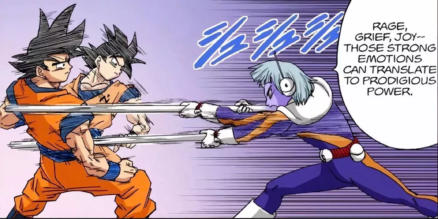 Granolah lucha con creativos ataques de ki que recuerdan a los de un hábil arquero. La batalla de Goku y Vegeta contra Granolah está llena de combates convincentes y ataques dolorosos. También marca la introducción del Ultra Ego Vegeta, que no es poco. Sin embargo, este combate del manga es tan memorable porque al final se convierte en un choque psicológico tanto como físico. Granolah acepta poco a poco que Goku y Vegeta no son los culpables de la muerte de su madre y acaba alineándose con ellos mientras se enfrentan al verdadero enemigo, Gas.