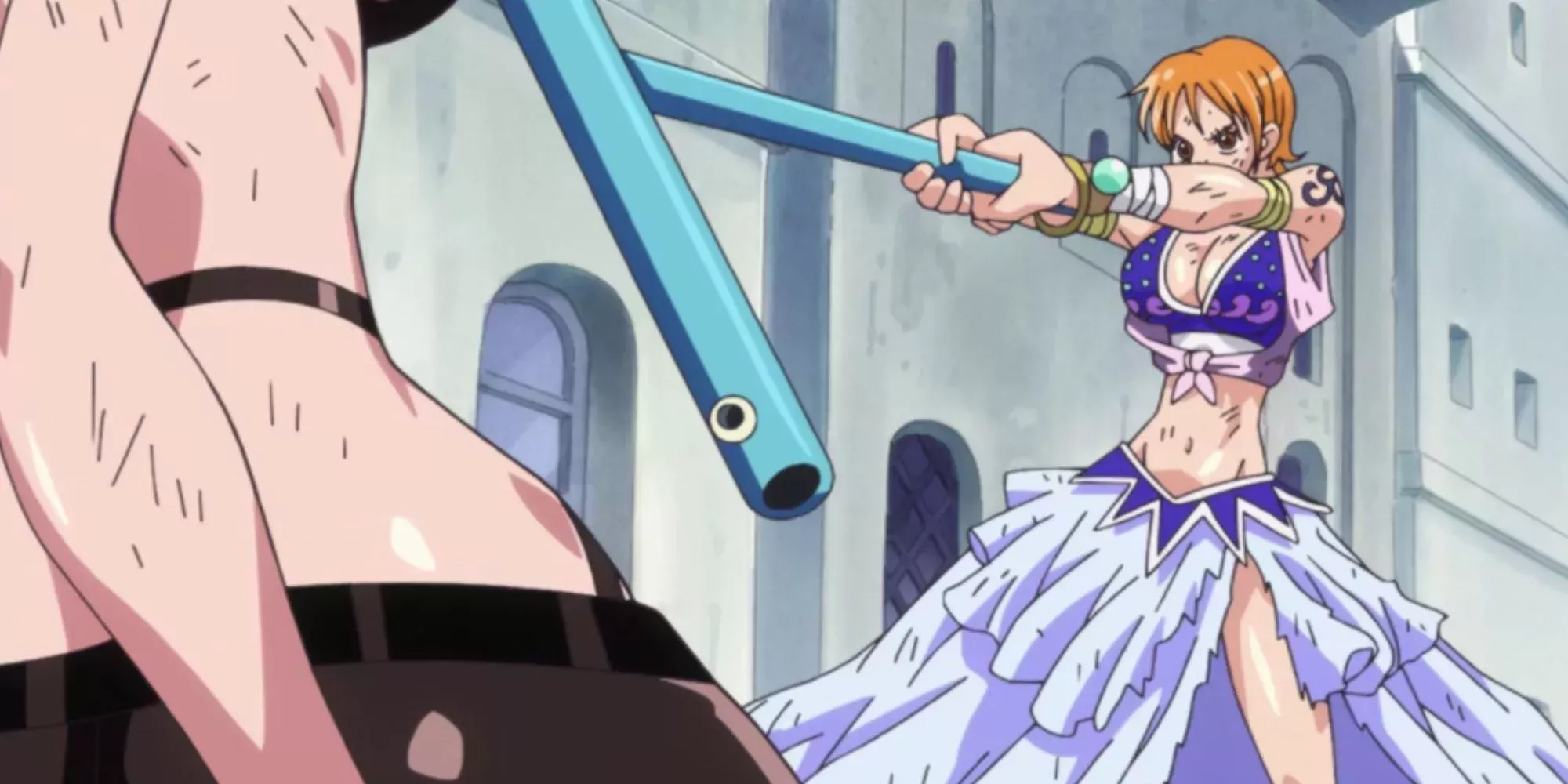 Nami, la tsundere navegante de Luffy, estaba más acostumbrada a robar tesoros y leer el tiempo que a luchar contra nadie. Entonces, decidió empezar a luchar de verdad, así que Usopp le dio un bastón meteorológico segmentado.
