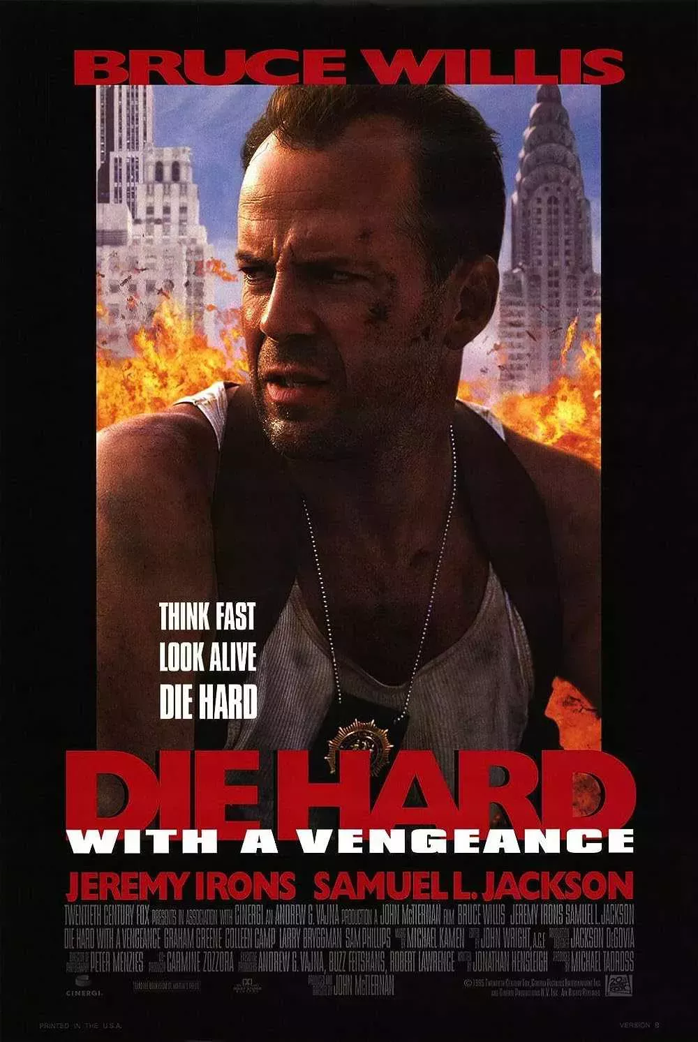 Jungla de Cristal y Venganza sigue a McClane y Zeus en su búsqueda de las bombas, que se intensifica y desemboca en un enfrentamiento con Simon y su banda. A pesar de sus diferencias, los dos improbables socios siguen la pista de Simon cuando empiezan a darse cuenta de que todo es una distracción para un atraco. La película es la mejor secuela de Jungla de Crist al después de la original y sigue siendo una de las mejores películas de Willis gracias a sus despiadados villanos y su divertido guión.